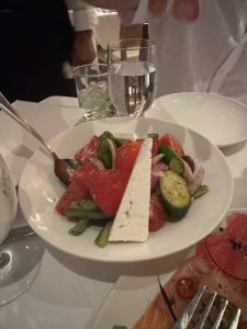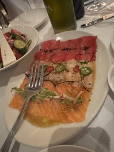 🍽️ The food? Absolutely phenomenal! We started with house-marinated olives, sashimi crudo (a must! see the pic, it’s a showstopper), and a trio of hummus and dips. The Greek salad with tomatoes, cucumber, olives, and a slab of feta was perfectly refreshing. For mains, we shared perfectly grilled lamb chops and delicate sea bass, paired with a red wine (we don’t pair the typical way) and vodka sodas.